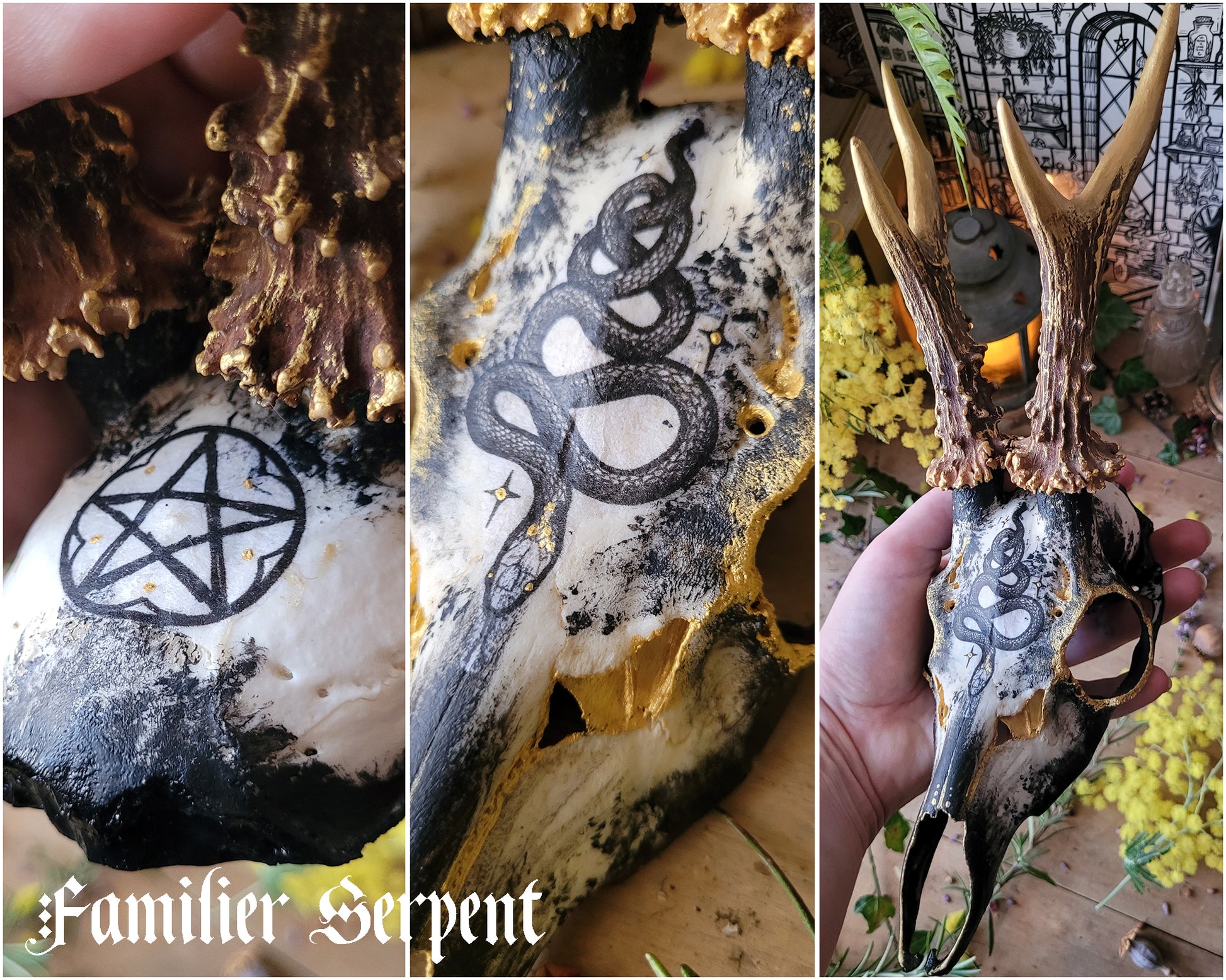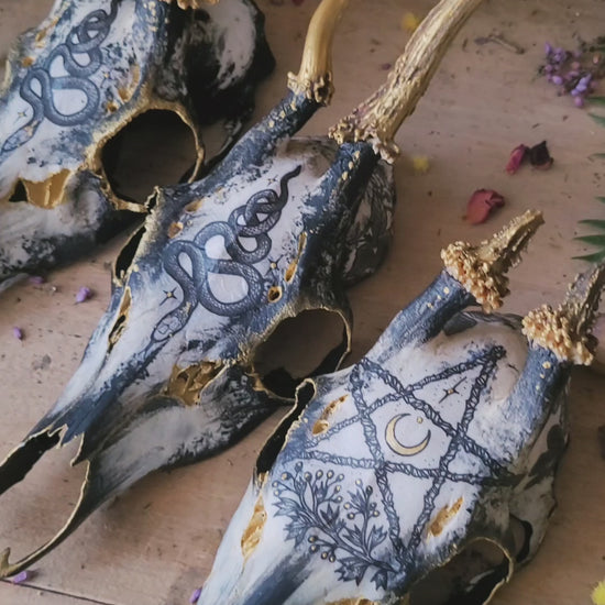 These deer skulls can be hung or placed, and they measure approximately 22 cm for the two smallest and approximately 27 cm with its antlers for the largest. Purification was done by fumigation. Regarding their solidity, you can handle them without fear overall. The most fragile part is at the end of the muzzle, and of course you will have to avoid falls!