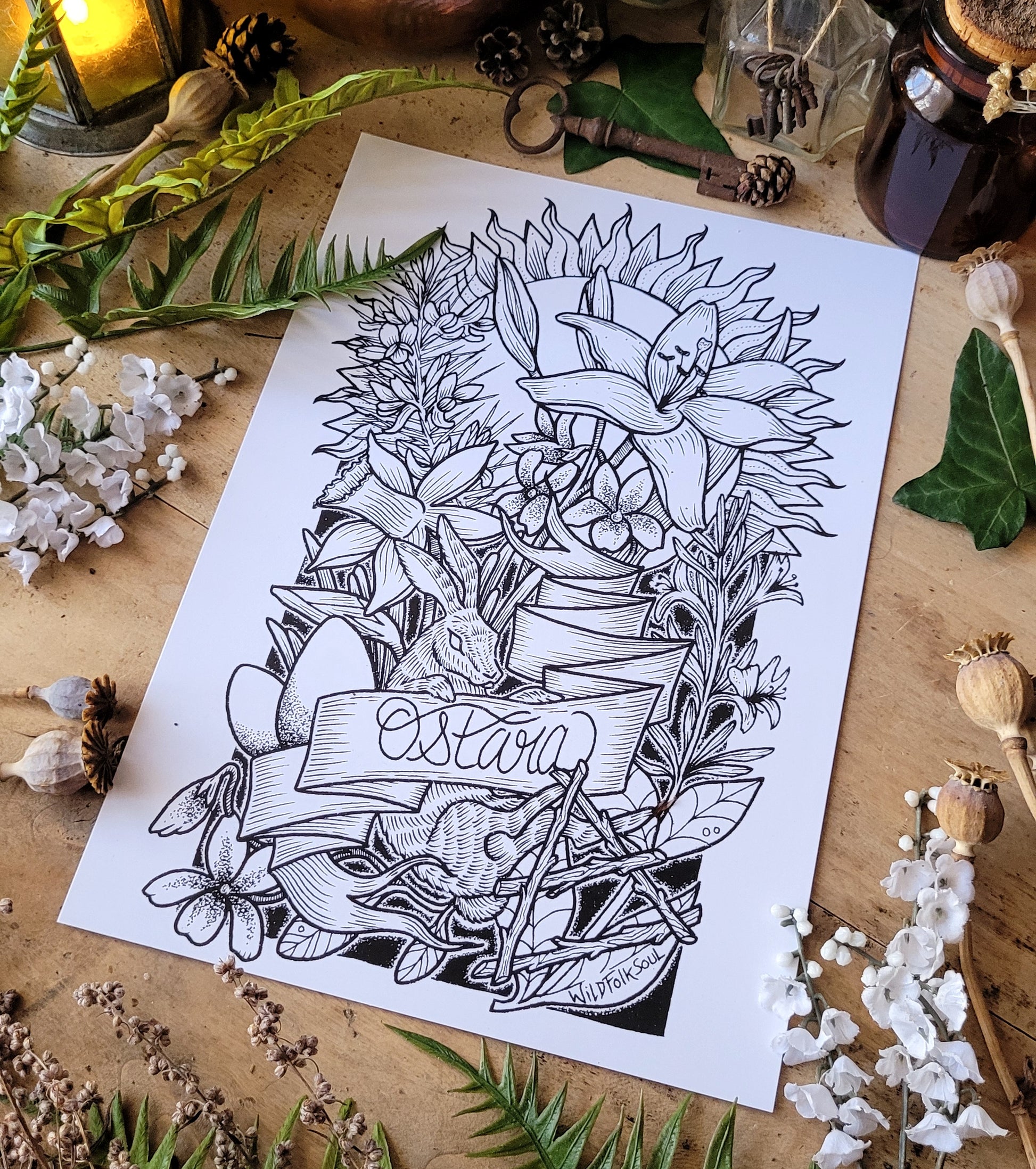J'ai choisi pour cette illustration des plantes rattachées à Ostara. Ainsi, nous avons un brin d'ajonc et de chèvrefeuille, des lys, une belle jonquille et de petites violettes épanouies. Tu auras probablement remarqué le lièvre et les œufs, qui sont également des symboles forts de ce sabbat. Et bien sûr, il y a le symbole de l'élément Air, l'exemple parfait des intentions rattachées à Ostara...