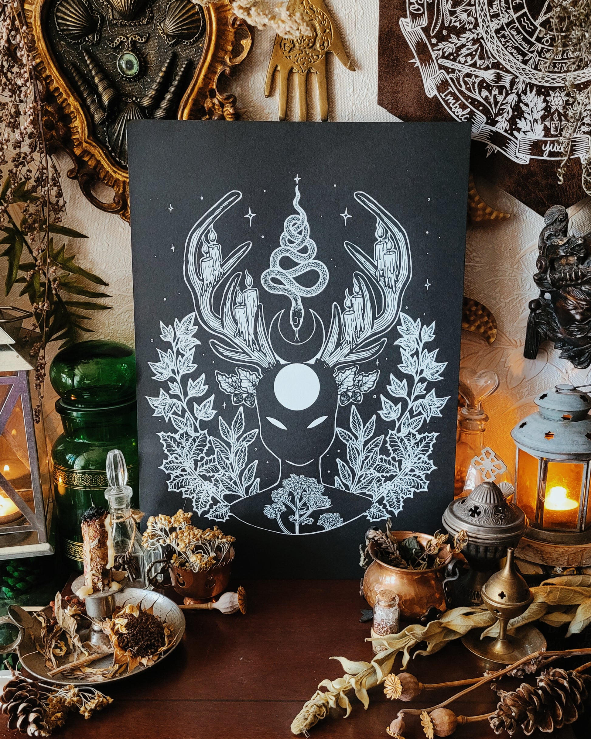 Toutes les plantes qui composent l'illustration sont liées au culte de Cernunnos. Ainsi, nous avons le lierre, le laurier, l'achillée millefeuille, le houx ainsi que le chêne. Le serpent est aussi un de ses attributs, celui qui me parle le plus concernant cette déité (et sans la tête de bélier!)