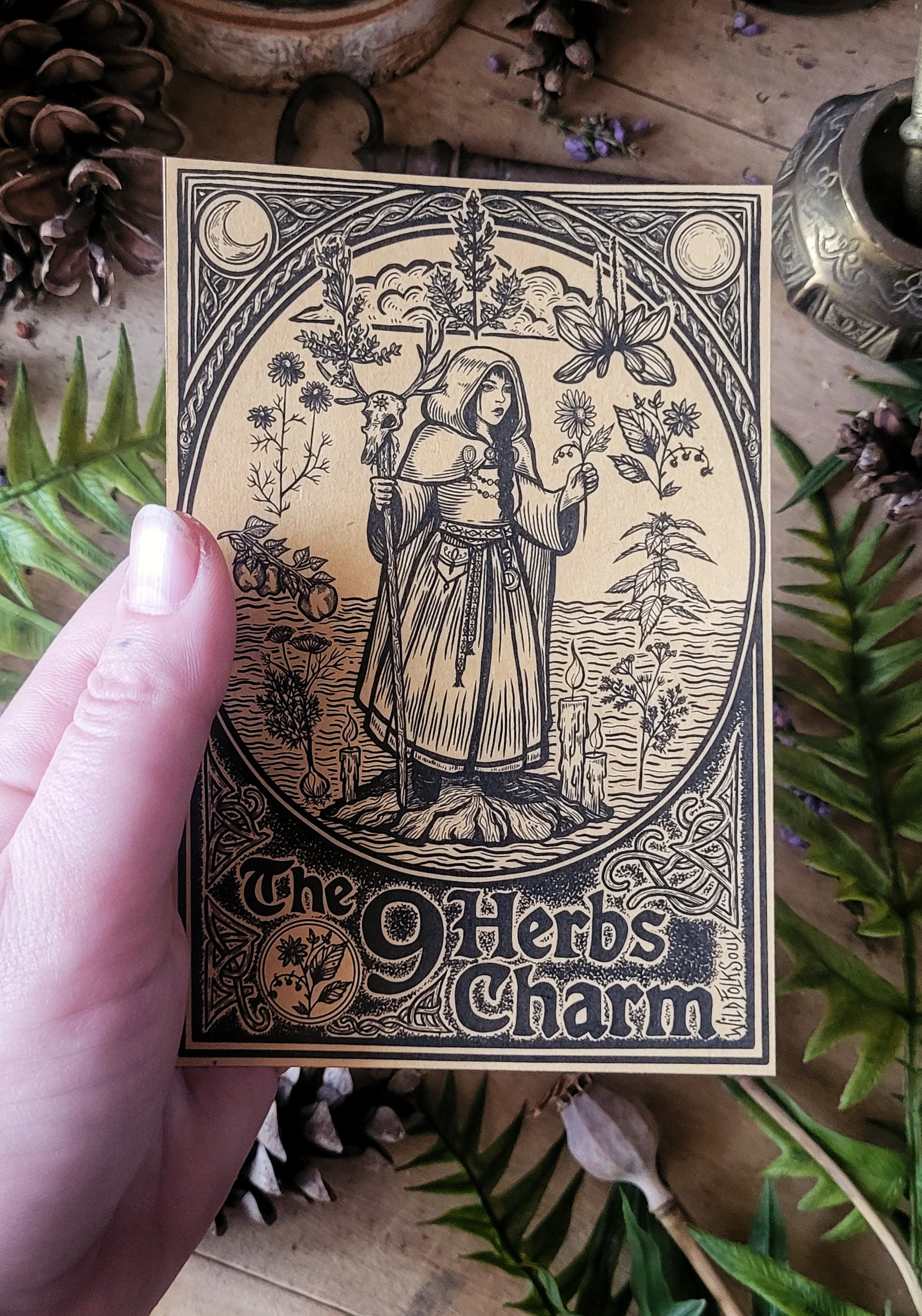 Ce charme associe neuf plantes aux vertus protectrices et curatives, récitées en poésie et accompagnées d’un rituel pour chasser le venin, les infections et les poisons.