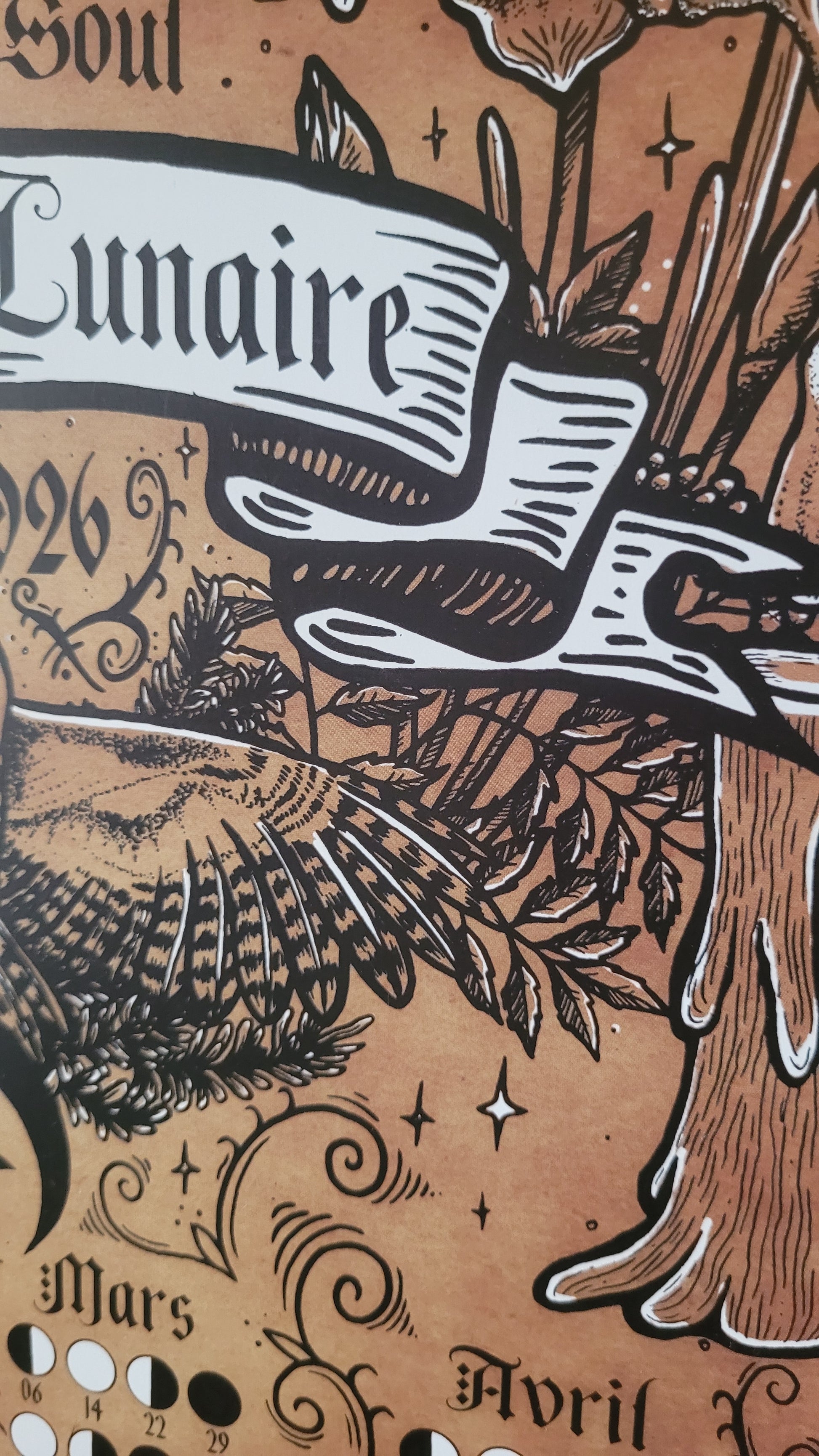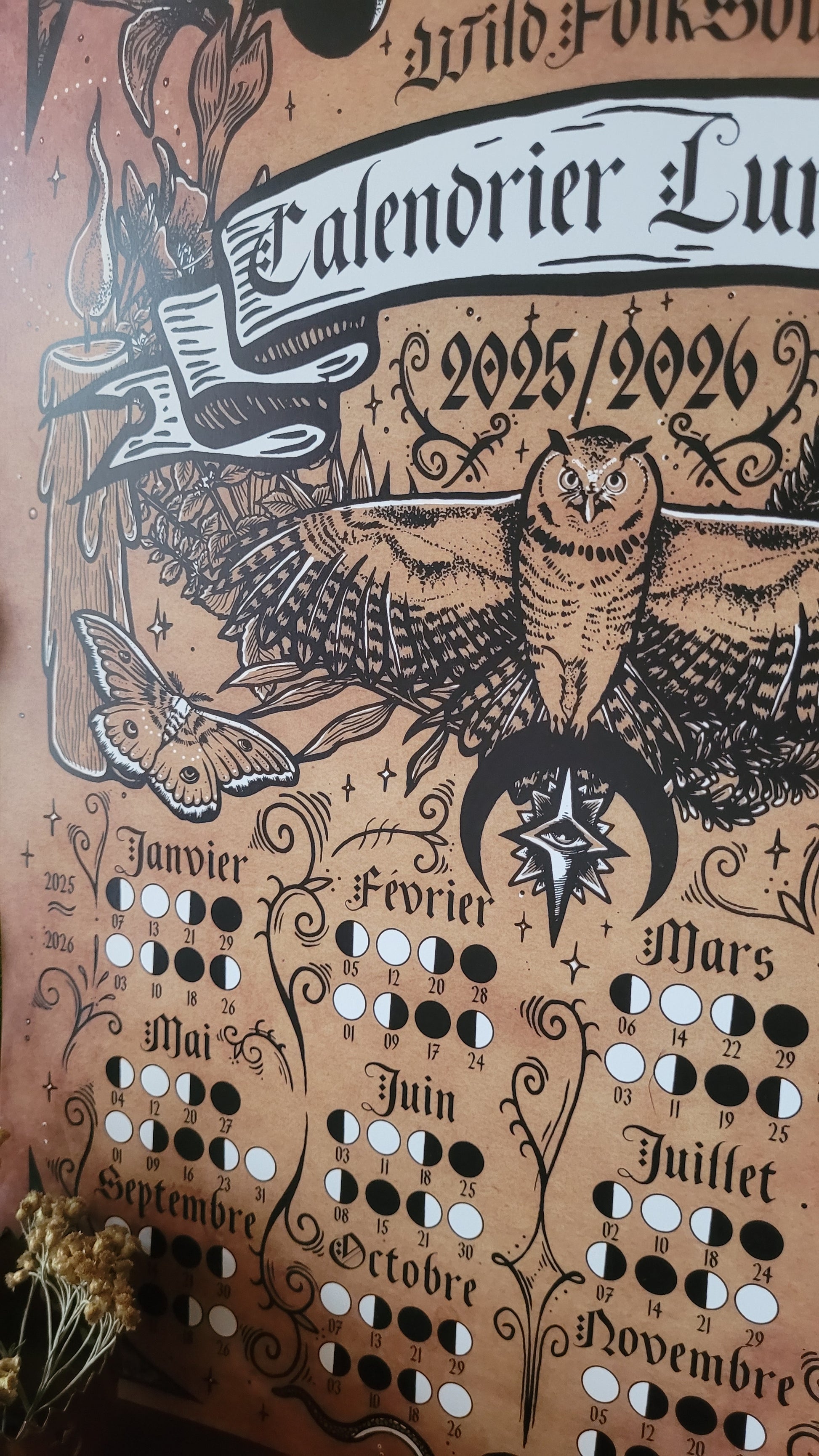 Concernant l'illustration, j'ai souhaité faire figurer sur ce calendrier de nombreux symboles rattachés à la Lune, tel que le hibou et le serpent. Tu auras aussi probablement remarqué les deux papillons de nuit, un polyphème d'amérique (à gauche) et un papillon lune (à droite)