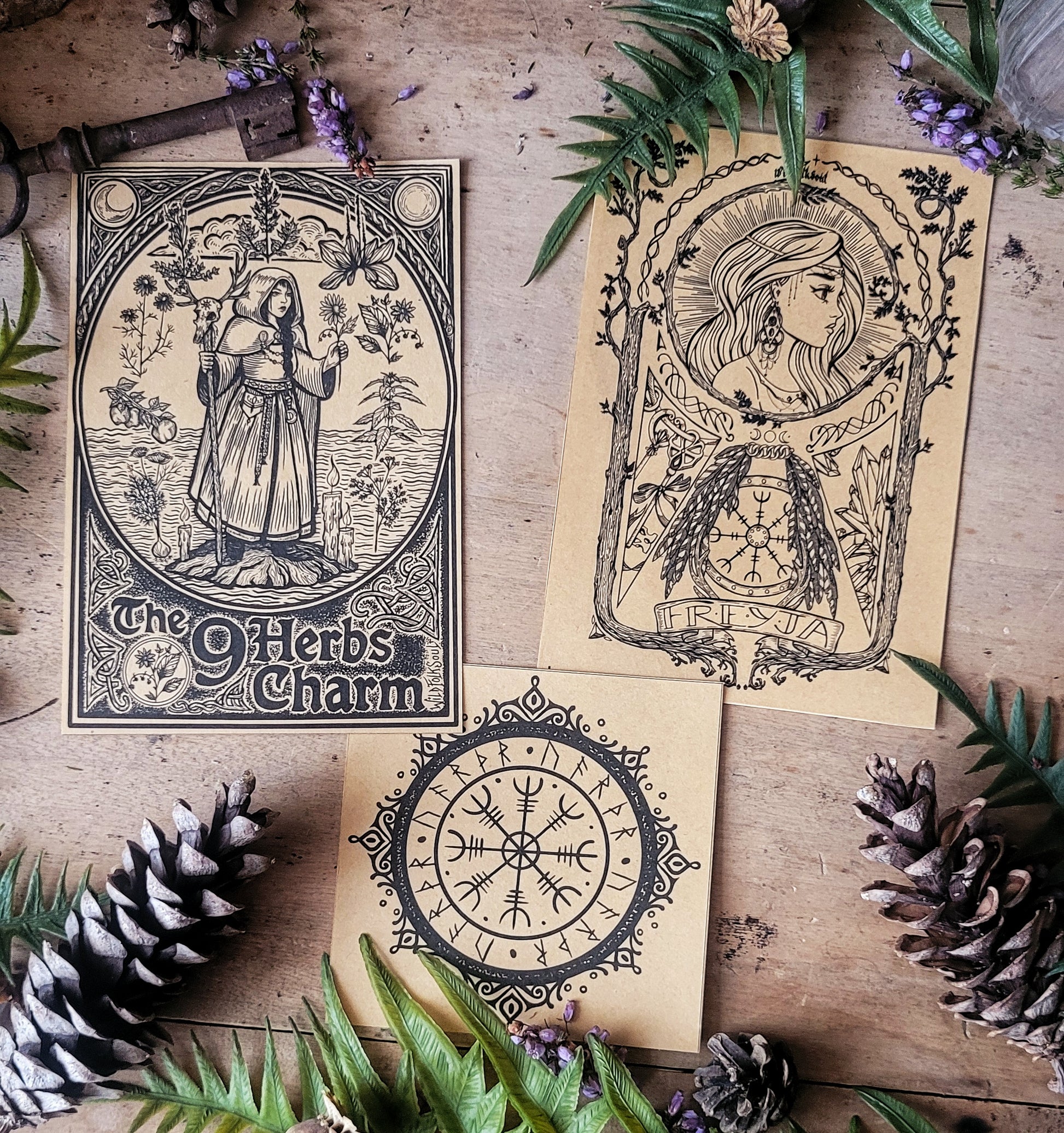 ✦ Ces autocollants mesurent 9 x 9 cm (Rune&Roots) et 9,8 x 14,4 cm (Charme des 9 herbes) 10.2 x 14.2 cm (Freyja) sur papier kraft, pour une utilisation en intérieur de préférence (couche de vernis uniquement)