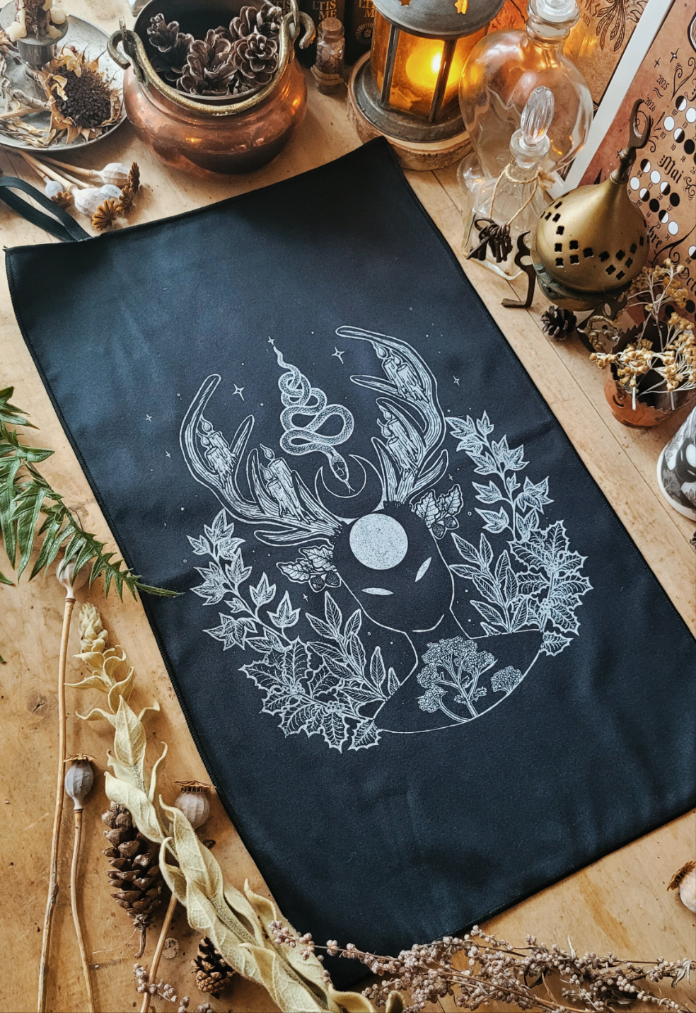 Toutes les plantes qui composent l'illustration sont liées au culte de Cernunnos. Ainsi, nous avons le lierre, le laurier, l'achillée millefeuille, le houx ainsi que le chêne. Le serpent est aussi un de ses attributs, celui qui me parle le plus concernant cette déité (et sans la tête de bélier!)