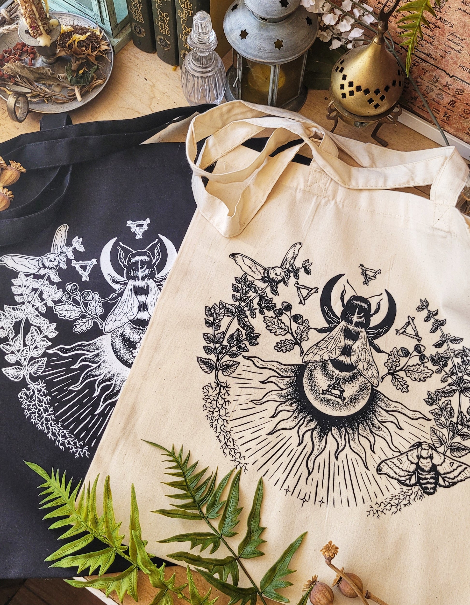J'ai également voulu y inclure la lune et le soleil dans un équilibre subtil du cosmos, ainsi que les 4 éléments, dominés par le feu et la terre, rattachés aux abeilles et à l'abondance.